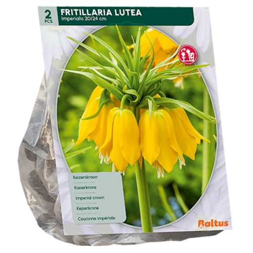 Fritillaria imperialis kukkii riippukukilla maalis-huhtikuussa. Fritillaria imperialis 'Lutea' korkeus on noin 60-70 cm. Kukinnan jälkeen Fritillaria imperialis 'Lutea' muodostaa silmiinpistäviä siemenpalkoja. Fritillaria imperialis 'Lutea':n kasvupaikan tulee olla aurinkoinen ja maaperän hyvin kuivattu.. Pakkausyksikkö: 2