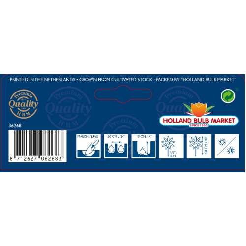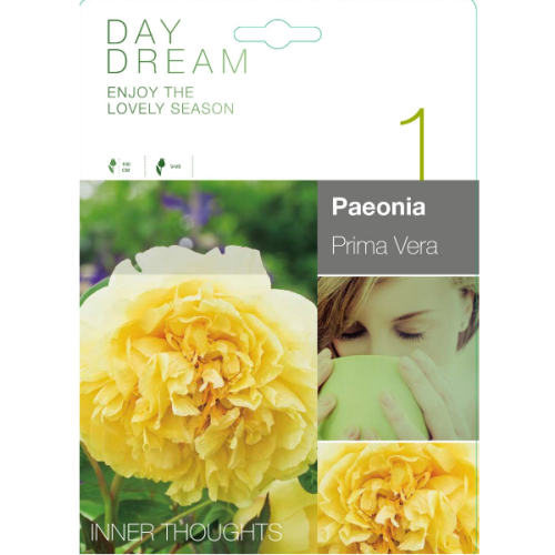 Pioni Prima Vera, 1 kpl . Anemone tyyppi. Kukka, jossa on kermanvalkoisia, kupitettuja suojia harvoin punaisella roiskeella; keskus koostuu lyhyistä, kapeista keltaisista terälehdistä, jotka muuttuvat vaaleiksi iän myötä. Kohtalaisen tuoksuinen. Hyvä, tummanvihreä lehdet. Runsas kukinta. Kukinta-aika: heinä- syyskuu.